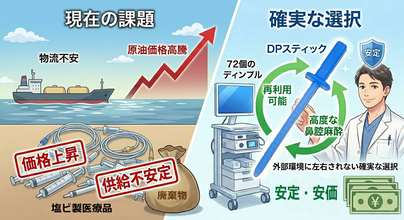 DPスティック コーナー ノーズピース コーナー 経鼻用枕 コーナー シリコン製リユース製品が安定した医療継続とコスト削減をお約束します。原油価格の高騰、不安定な物流情勢。 今、医療現場では塩ビ製ディスポ製品の「価格上昇」と「供給不安定」が大きな課題となっています。 経鼻内視鏡の前処置も例外ではありません。シリコン製で再利用可能なDPスティックは外部環境に左右されず、確実で安価な鼻腔麻酔をお約束します。 お知らせ ・DPスティックが医学書院が運営する消化器関連サイト「Medical Mashup」 で取り上げられました。 ・2026年5月8日開催の第95回内視鏡技師学会(大宮)にDPスティック、ノーズピース、経鼻用マクラを出展いたします。 詳しくはコチラをご覧ください ◇ ご購入方法はコチラ ◇ 製造販売 株式会社 豊栄 本社・工場 〒277-0924 千葉県柏市風早1-9-7 TEL:04-7192-3321 FAX:04-7192-3310 ◇ 製造販売 株式会社 豊栄 〒277-0924 千葉県柏市風早1-9-7 TEL:04-7192-3321 FAX:04-7192-3310 経鼻内視鏡のテクニックについては、こちらのサイトをご参考にして下さい。 DPスティック開発者である大原医師による経鼻内視鏡の実践的なテクニックを解説しているサイト(サイト名:経鼻内視鏡のテクニック)です。 → TOP