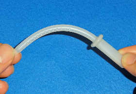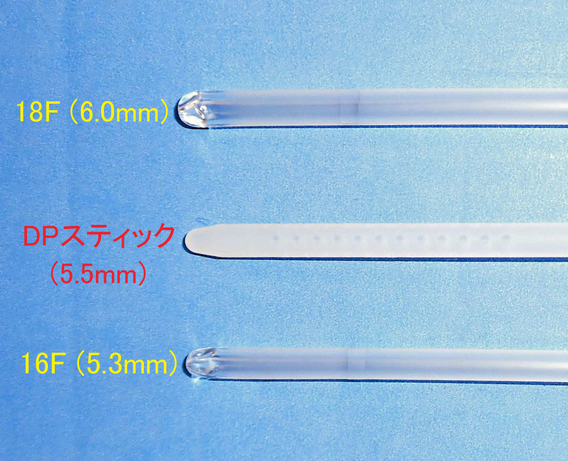DPスティックの挿入径は5.5mmです。正確には、既存のディスポスティック16F(5.3mm)と18F(6.0mm)の中間よりやや16F寄りです。(左写真)そのため、ディスポスティック16Fまたは18Fと同様の使用法が可能です。現在、16F/17Fディスポスティックをお使いの施設では、スムースにDPスティックを導入して頂けると思います。ただし、内腔・側孔はありませんので側孔ありディスポスティックの代用はできません。