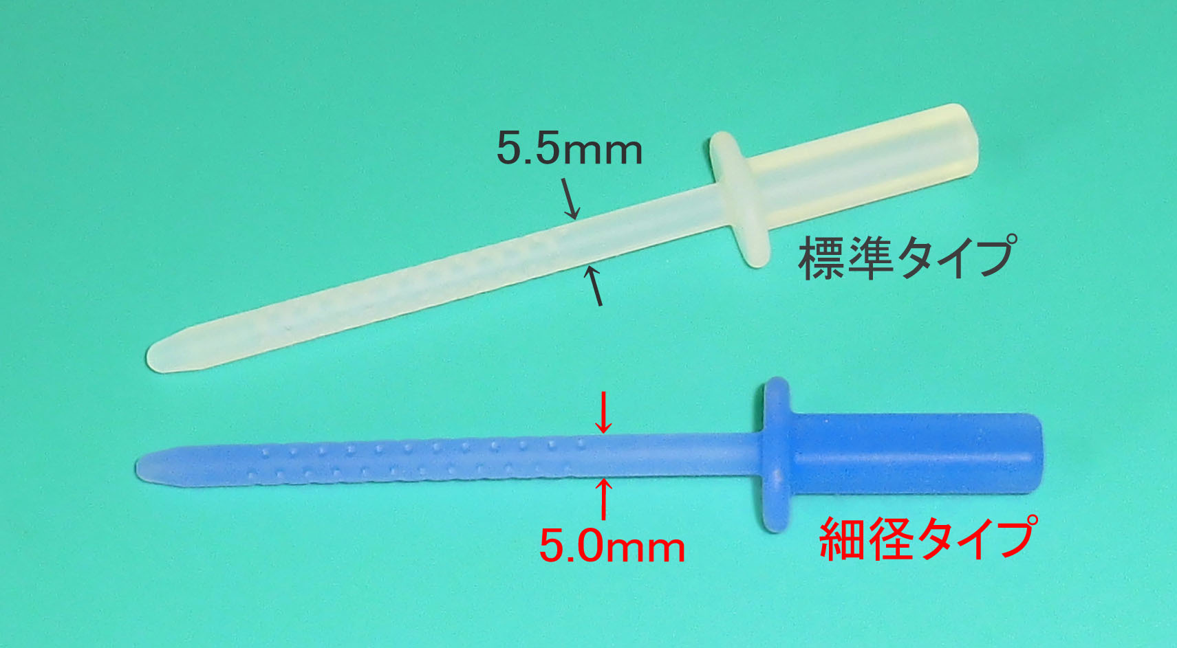 DPスティックは標準タイプ(挿入部径5.5mm)と細径タイプ(挿入部径5.5mm)の2タイプがあります。細径タイプは、挿入時の鼻痛をさらに抑制し、前処置が不慣れなスタッフでも容易に鼻腔挿入が可能です。